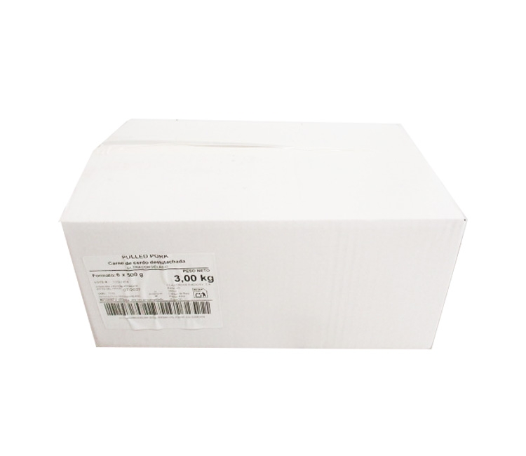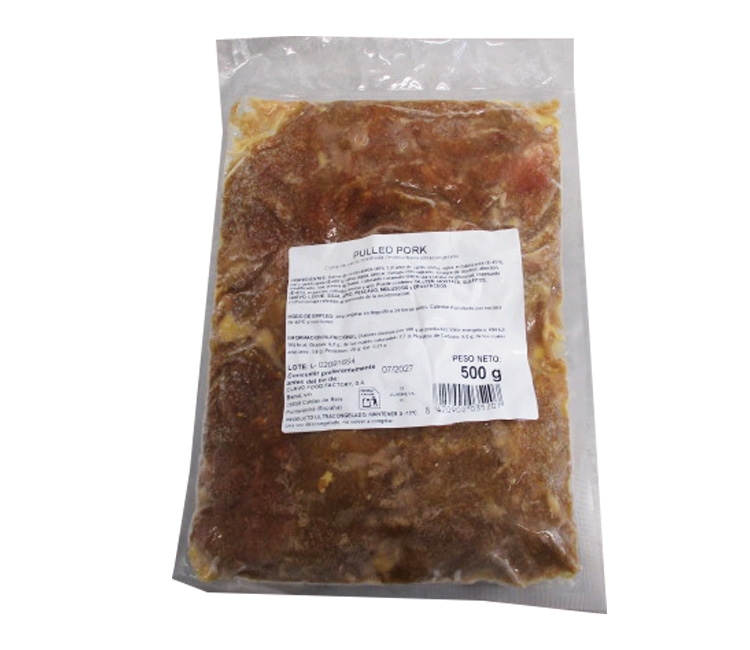 Descripción: Carne de cerdo marinada asada y deshilachada, acompañada con salsa barbacoa, envasada al vacío y congelada
