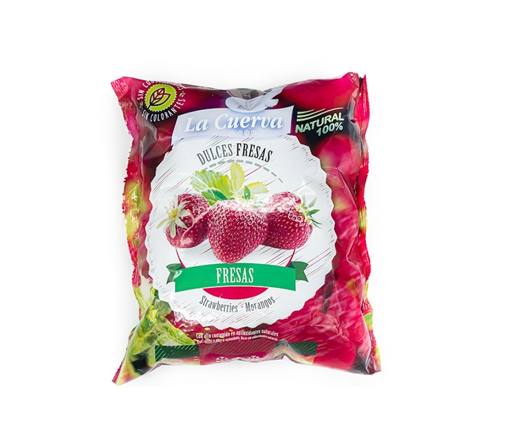 Descripción: Fresa entera, sana y en su estado de madurez justo, sin adición de azúcares, agua o conservantes, congelada en IQF y embolsada